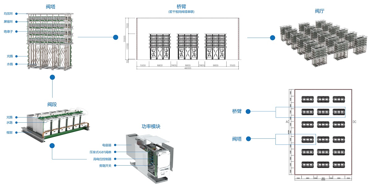 ● 电压等级高和输电容量大——最高电压等级±800kV,已投运产品最大容量5000MW,最大设计容量16000MW ● 可靠性高——全链路冗余阀控制系统避免单一板卡故障引发功率模块旁路,多级冗余本质安全可靠旁路技术,避免单一功率模块故障引发系统闭锁跳闸 ● 环境适应性强——采用全气密压接式功率器件,结合高环温、高水温、高防腐、高抗震耐受性能提升设计,通过盐雾、霉菌、振动等环境试验检验 ● 功率密度高——开发应用新型更高电压等级压接器件,结合紧凑轻量化设计,有效降低换流阀占地、体积、重量和损耗 | ● 运行效率高——新一代低损耗压接式IGBT换流阀效率高于99.3% ● 控制性能优——控制周期可达25μs,控制链路延时低于25μs,支持512级模块在单个控制周期内不分组实时控制 ● 维护性好——易维护功率模块结构和阀塔设计,自主开发换流阀健康状态专家系统,实现基于大数据的智慧运维计划 ● 支持多种器件混用——可单一使用或混用多品牌、多种类、多电压等级功率器件,不同器件功率模块可实现全方位兼容设计和灵活互换 |