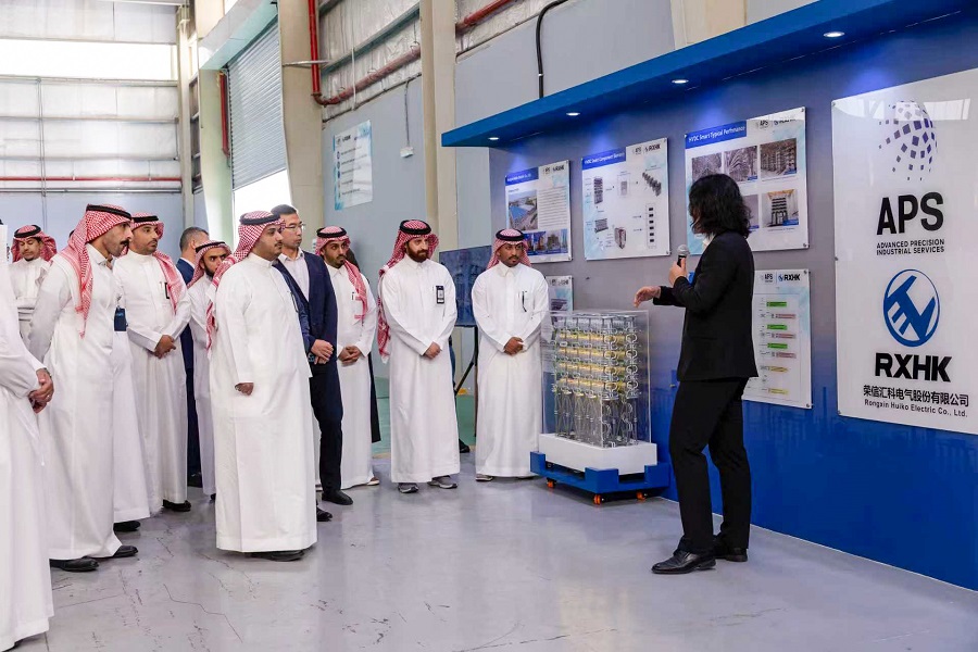 在开工仪式现场,荣信汇科与APS公司详细阐述了本地化合作规划、工厂布局及建设历程。沙特电力公司(SEC)高层对本地化工厂的高水平建设和按时交付运营给予了高度评价,指出该工厂的建设既契合沙特产业升级本地化的需求,也为中沙技术交流与产能合作提供了优质范例,并殷切期待早日完成沙特中西工程4套换流阀的生产测试工作,实现设备的高质量交付与成功投运。